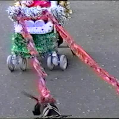 X-mas; Baby Santa. Child dressed as santa is pulled in stroller by 2 dogs dressed as reindeer. Christmas Tape
