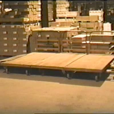 Warehouse worker rides forklift fast up ramp and crashes, falls. Man hits into another hand truck hard.