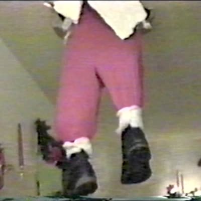 X-mas; Santa's Coming, Whoops. Santa comes down chimney, somersaults and knocks woman over. Christmas.