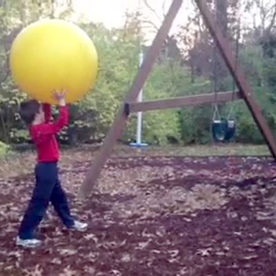 A girl on a swing kicks a large yellow ball her tot brother toss at her, and then the tot boy gets knocked to the ground outdoors.