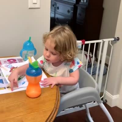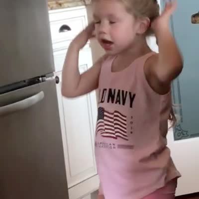 A tot girl sings her ABC's in the kitchen as she closes her eyes and repeats "H-I-J-K-M-N-O-P".