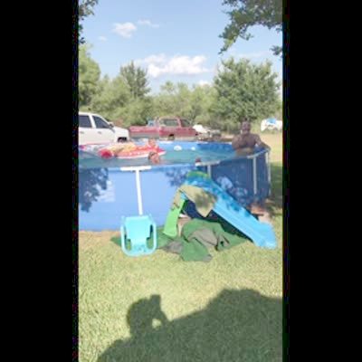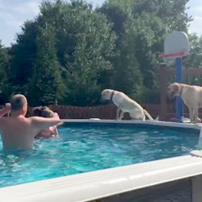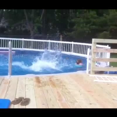 Dog runs & jumps over side of above-ground pool to go swimming with adults.
