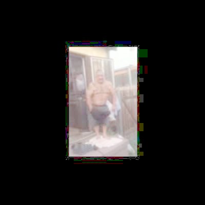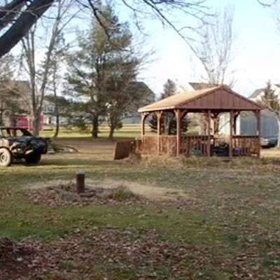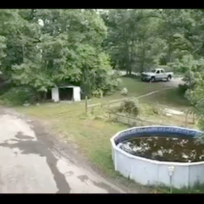 The wind makes an above ground pool fly up and hit a man in a backyard. Graphics.