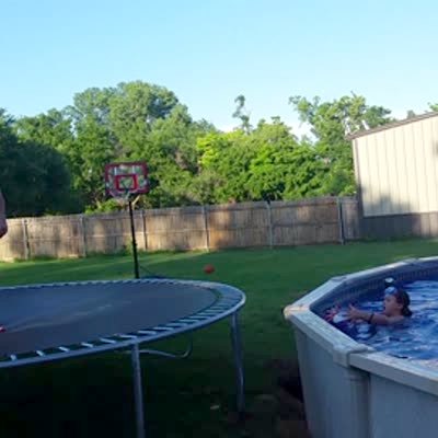 Man tries to jump off fence into above-ground pool holding sprinklers in back yard, fence breaks and man falls to ground.