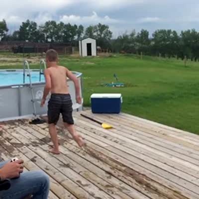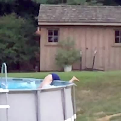 Teen boy jumps from balcony of the house into above ground pool, he hits the side of the pool and falls. Short tail, no recovery. Bonehead.