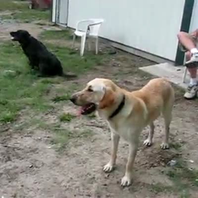 Man goes through side of inflatable above ground pool. Black lab dog was sitting on the ladder when it collapses and he falls.