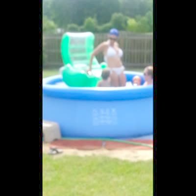 A woman falls out of an above ground pool while attempting to get on a float. Action at :07.