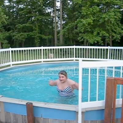 A woman stands on top of a ladder and prepares to jump into an above ground pool fully clothed as part of a cold water challenge, but when she goes to jump, the ladder falls over and she falls into the side of the pool, denting it.