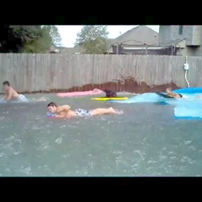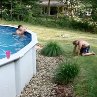 A man dives into an above ground swimming pool and cuts a hole in it from the inside. It rips apart and the man floats out along with all the water after he and a woman joke about being born. The backyard is flooded.