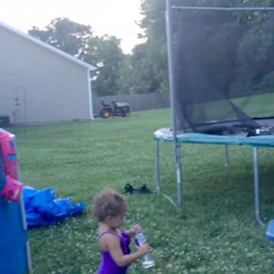 Little girl tries to run and jump off deck into above-ground pool like brother and sister before her, stumbles all the way across deck into pool. Trip, fall