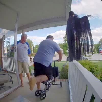 "Accidental Accident Re-Enactment" A man hops out of a front door onto his knee scooter after an injury, then topples over onto a sidewalk when he tries to step down. Security footage.