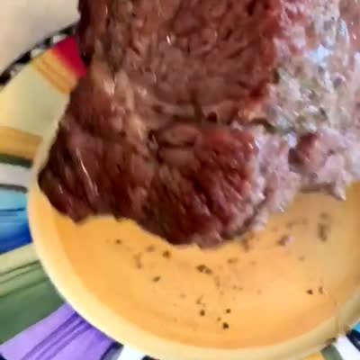 A woman accidentally flips over the plate and knocks a pot roast onto the floor.