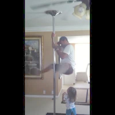A man dances with a tot boy in the living room and accidentally bumps into a young boy with his butt and knocks him down. Music rights not cleared.