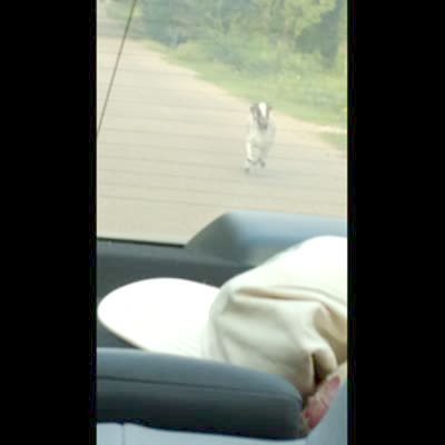 A goat runs behind / chases a car while the car drives on a road. Follow. Acts like a dog