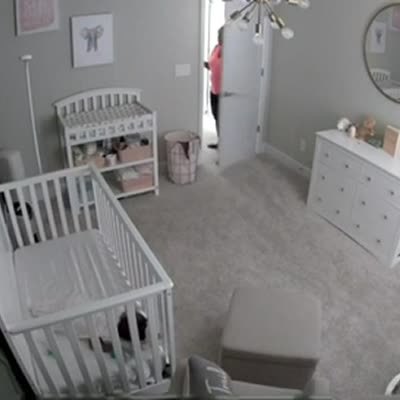 A woman walks into a bedroom to catch her baby playing instead of sleeping, then a baby girl immediately falls down in a crib to pretend she's sleeping. Security camera footage.