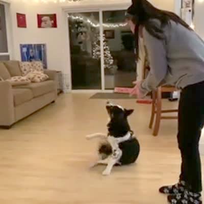 A teen girl makes a finger gun, then points to her dog and says bang. The dog rolls onto her back in the living room and the girl gives her a treat as she laughs.