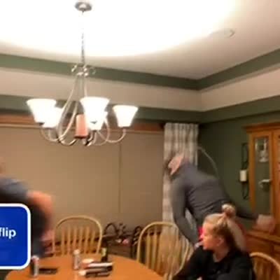 A man hits a chair in the dining room and falls as he tries to act out the clue, "Doing a Backflip" on the game Heads Up.