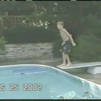 Boy stands on diving board at pool & hesitates. When he jumps, a ball flies in from off-camera & hits him in the head mid-air.