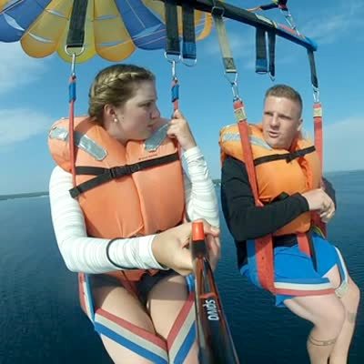A man proposes to a woman as they parasail but he drops the ring. She comforts him and tells him that she still loves him, and then he laughs and says it is a joke.