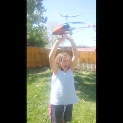 A man helps a girl pull out her loose tooth by tying a string from it to a remote control helicopter outdoors. When the man activates the helicopter it flies sideways into the woman holding the camera.