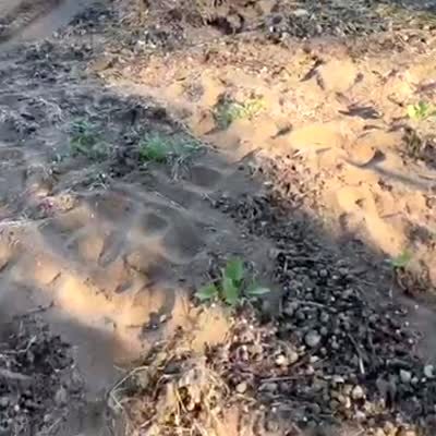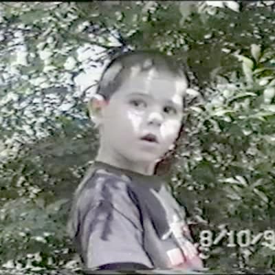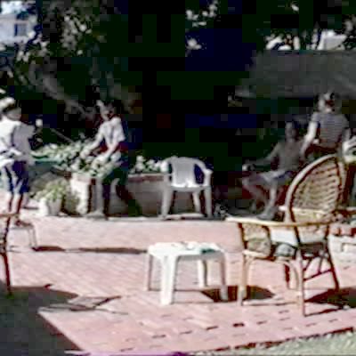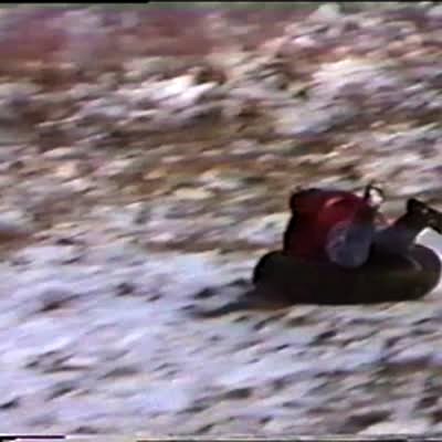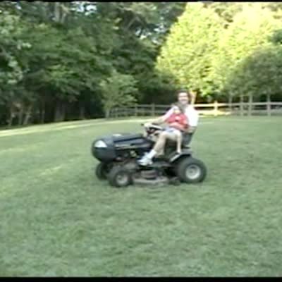 Man rides a tractor lawn mower in the backyard with a girl on his lap. They hit a tree when man is not paying attention & looking at the camera. Girl cries. Bonehead.