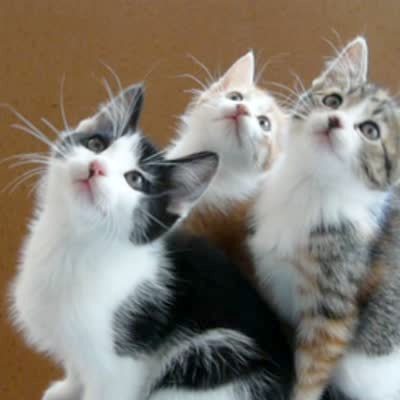 Three kittens move their heads back and forth in sync indoors. Cute.