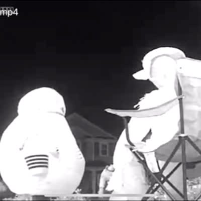 A talking mechanical scarecrow Halloween decoration sits in a lawn chair on the front porch of a house, with a censor on the doorstep, to activate it. A young girl in an inflatable costume trick-or-treats, and walks to the house. The scarecrow jumps and screams, and the girl screams and runs from the house. Secondary source, from home security camera.