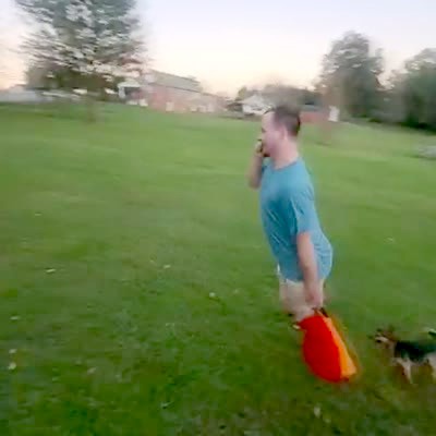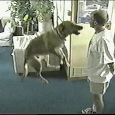 "Park Loving Pooch" Man asks big dog if he wants to go to the park and play fetch. Dog is so excited he repeatedly jumps about four feet in the air.
