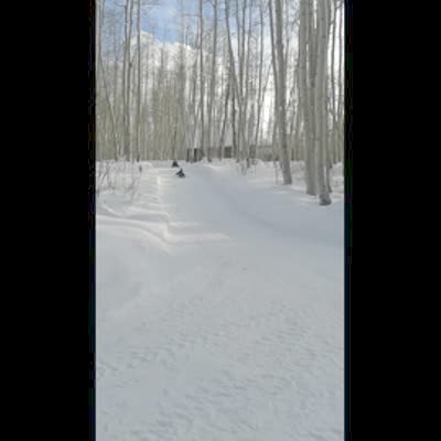 A boy sleds down a hill when his sled stops short and he flies off of it into the snow outdoors.
