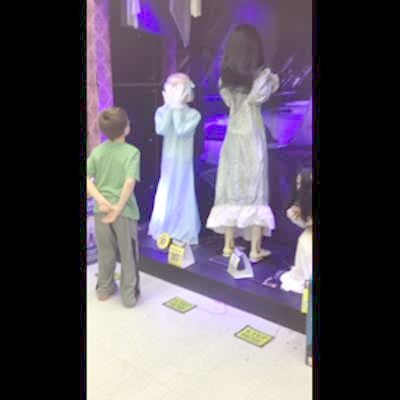 A boy activates a moving Halloween display in a store then screams and falls over backwards when it pops up in front of him.