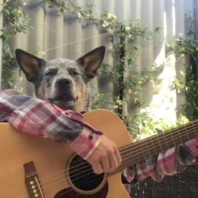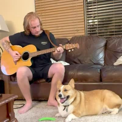 A man dedicates a song to his dog in the living room. The man sings a song and plays guitar for the dog while the dog chews a toy next to him. The dog starts to cough in the middle of the song. The man starts to laugh and says, "We've got to do that again."