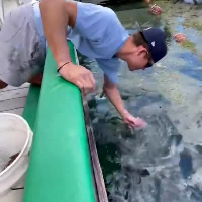 A man says that he can feed fish by hand on a boat and he slaps a piece of fish against the water repeatedly. A large tarpon fish comes out of the water, grabs the food, and pulls the man into the water.