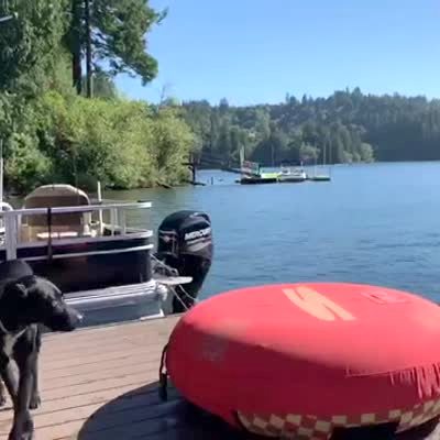 Three young girls jump from an inner tube into the lake water. Then a man tries it and he slips on the dock and rolls into the water. Dogs watch.
