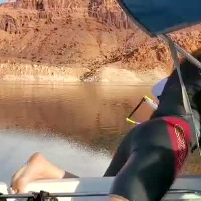 A woman crawls out onto a pole off the side of a boat to ski on her feet but she falls into the water.