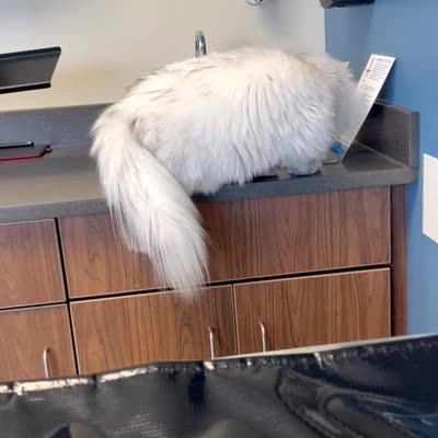 A cat at the veterinarian's office stands on the sink and accidentally activates the automatic soap dispenser. The cat jumps into the air and runs away.