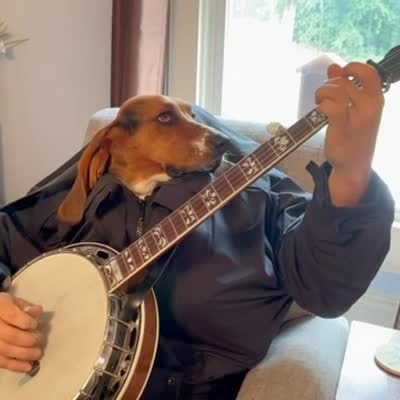 A dog sits in a living room and appears to play a banjo. Dogs with Human Hands.