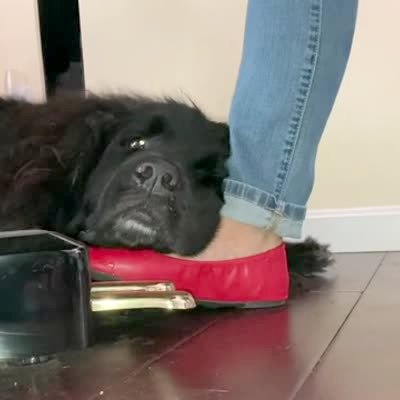 A woman plays piano while her dog lays its head on her foot pedal as it bobs up and down with her foot.