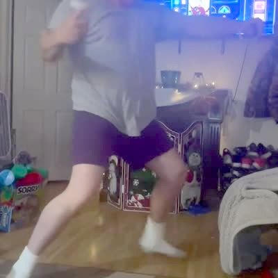 A man punches the air with virtual reality goggles on in the living room. Then a dog barks at him and jumps on his groin.