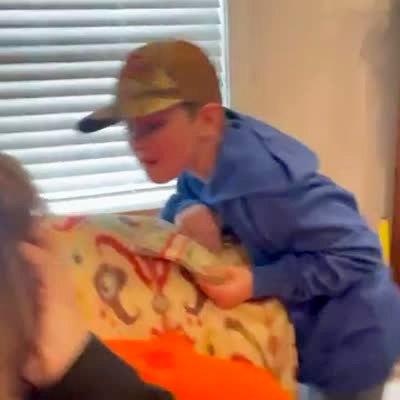 A young boy opens a box with a stack of fifty one-dollar bills and screams and smiles. Another young boy opens a box with a single fifty-dollar bill and he cries. His brother offers to trade. Christmas