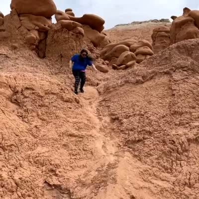 A woman walks down a trail on a mountain. She starts to run and then trips and falls.