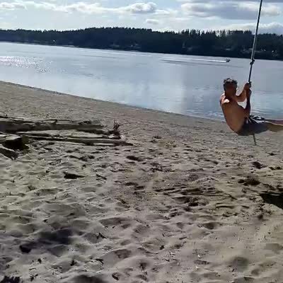 A man swings on a rope and a young boy grabs on then falls. People on the beach laugh. Slow Motion.