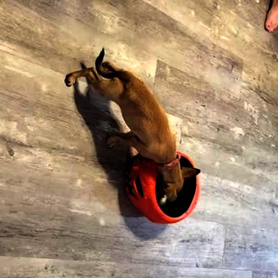 A woman puts food for a Chihuahua dog in a motion activated Halloween bowl that touches her head with a plastic skeleton hand and makes a loud sound. The dog just eats around the hand. Halloween.