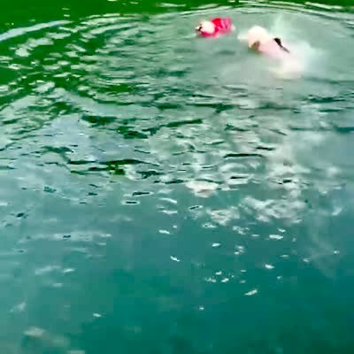 In a lake, two dogs swim and wear life jackets. The Pitbull notices that the Golden Doodle struggles to swim and leads it back to the dock.