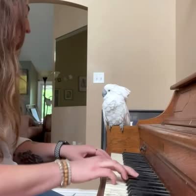 A woman plays the piano and a Cockatoo bird nods its head up and down in tempo. When the song really gets going, the bird gets very animated with its dancing.