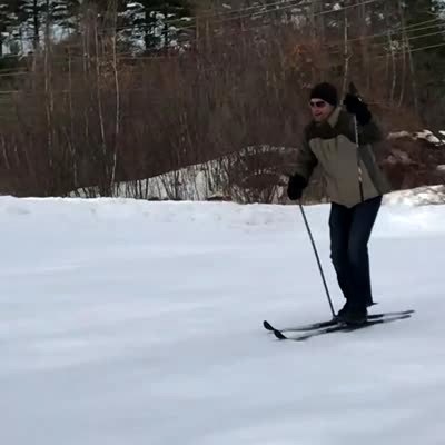 A man grunts while he carries a suitcase up a frozen street and onto a steep driveway. Then he falls and slides back down the driveway.