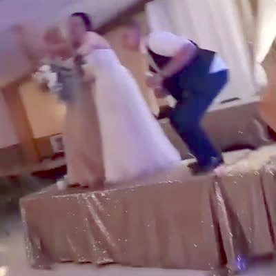 Two women and a man dance on a table at a wedding. The table collapses and they fall on the floor. No audio