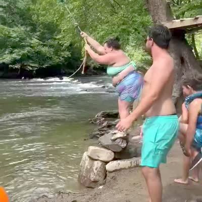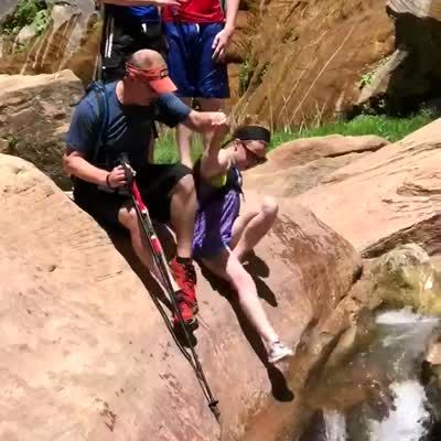 A man tries to help a teen girl climb down a rock over a narrow river, but she falls and he falls in with her.