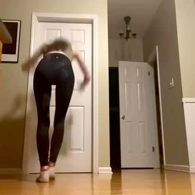 A teen girl attempts to do a handstand against a door which opens up as she flips over.