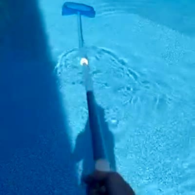 The woman with the camera uses a net to scoop a duck out of a pool. The bird swims away and climbs out of the pool. The woman runs at the duck and chases it away and the duck jumps back in the water.