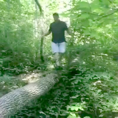 A man walks across a tree over a ditch outside. Then he falls off and hurts his groin.